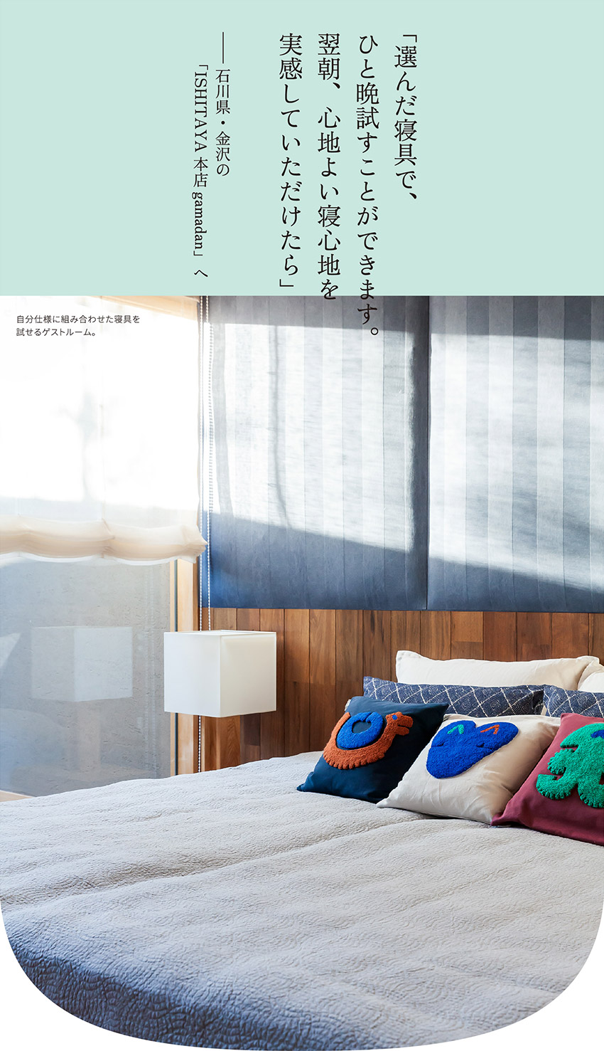 「幸せな睡眠は、幸せな人生をつくる」をモットーに、海外のトップメーカーの原料や製品を直接仕入れてオリジナル仕様の寢具を手掛けるISHITAYA。石川県?金沢にある本店gamadanのショールームにはゲストルームがあり、本格的な寢具體験ができるようになっています。