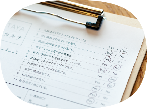 ヒアリング時には、質問に答えて「眠りのカルテ」を作成。その人に合わせた睡眠環境についてアドバイスが受けられる。