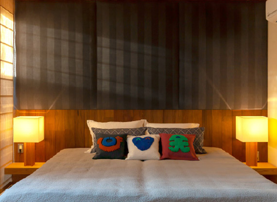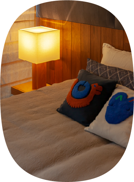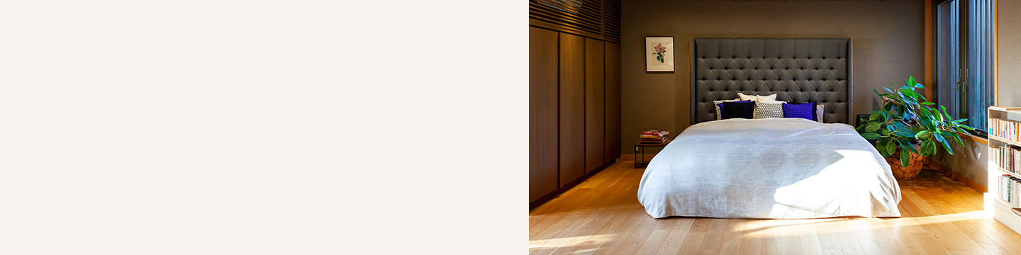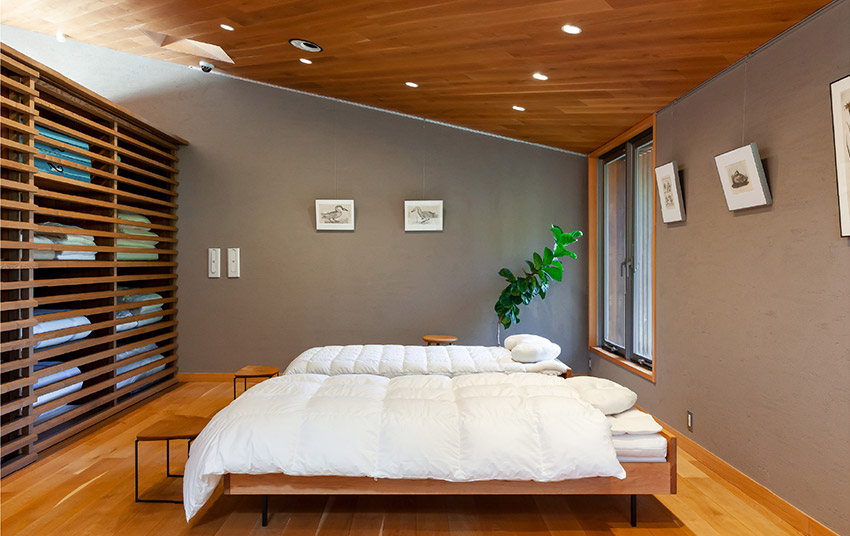 照明は蛍光色を避け、電球色のやわらかいスタンドなどで調整。「できれば遮光カーテンを使わず、自然光の明るさで目覚めるのが理想的です」。ISHITAYA本店gamadanのゲストルームではテレビなどもなく、眠ることに集中した室內環境が整えられている。
