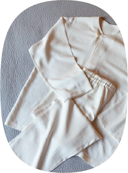 パジャマはなるべく締め付けのない、薄手でリラックスできるものを選ぶのがポイント。「パジャマも質の高い天然素材を選んで。シルクは保溫力があり、肌への親和性が高いのでおすすめです。一度試してみてほしいですね」。オリジナルのシルクパジャマ52,800円。