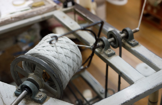 國內の工場で紡績されたウール糸は、ハンドタフト工場で糸巻きを実施。巻き具合でもラグ表面の印象が変わるそう。