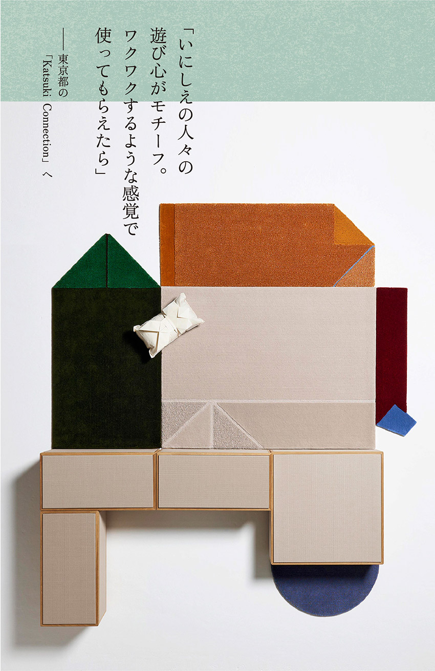 「旅というテーマはずっと自分のなかにある」という香月さん。新作では場所に留まらず、いにしえの人々の遊びの情景に出合うような「時空を超えていく旅」をイメージしたそう。「そこにいるけれども時空が違うような、もっと深い部分で楽しめる作品をつくりたいと思ったんです」。使う人のイマジネーションが高まり、さらにワクワクする暮らしがつくり出されていく…。ラグと呼応して素敵な旅を始めてほしい、そんな思いも込められています。