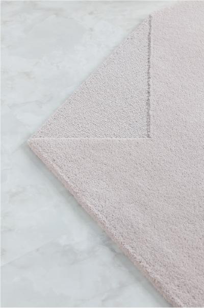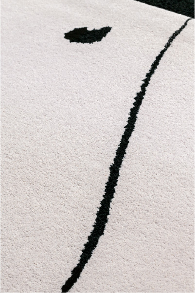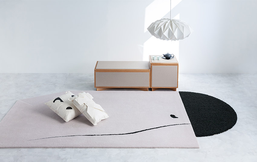 色や形の組み合わせが楽しい2021コレクションには、シンプルなコーディネートもあります。白いラグを和紙に見立て、そこに筆で墨を落とす、そんなイメージでつくられた「筆あそび」は、コレクションの中でも人気の1枚だそう。書に通じる、心を落ち著かせる空間ができあがります。