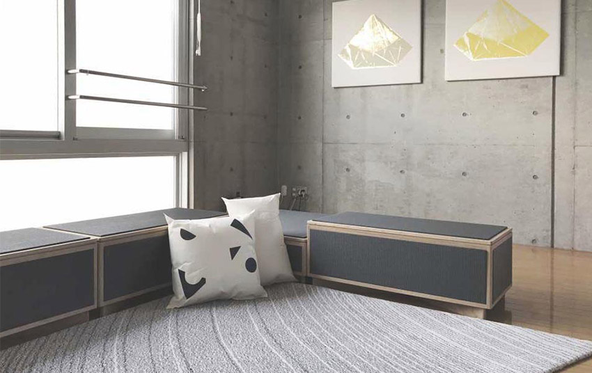 立方體のラグに座り、足元にもいろんな形のラグを敷いて。話も弾みそうな、楽しい集いの場に。