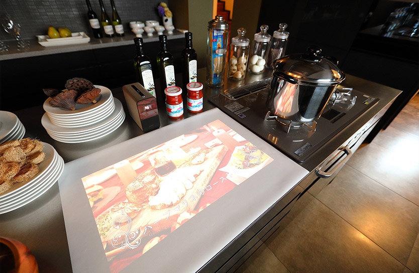 キッチンカウンターに夕食のレシピを映し出して調理スタート。