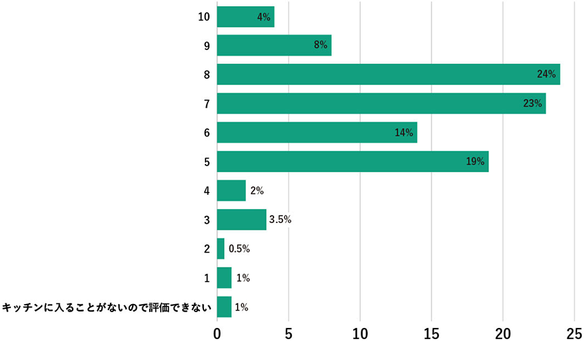 10が最も高いレベル、1が最も低いレベルとして、ご自身のキッチン衛生管理レベルをお聞きしました。「8(24%)」と「7(23%)」が多く、「7」以上を高評価とした場合、7~10と答えた方の割合は全體の59%を占めました。半數以上の方が、一般的に見てある程度の衛生管理レベルであると評価していると考えられます。また普通レベルの「5」以上を含めると、90%以上を占める結果となりました。