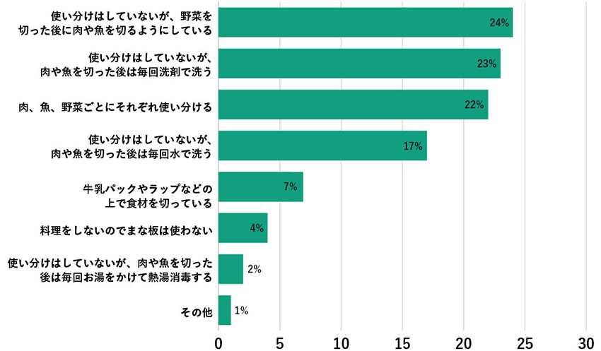 このように、まな板の使い分けまではしていなくとも、使うたびに洗ったり、食材の切る順番を工夫したりすることで食中毒を予防している方が69%と大半を占めました。