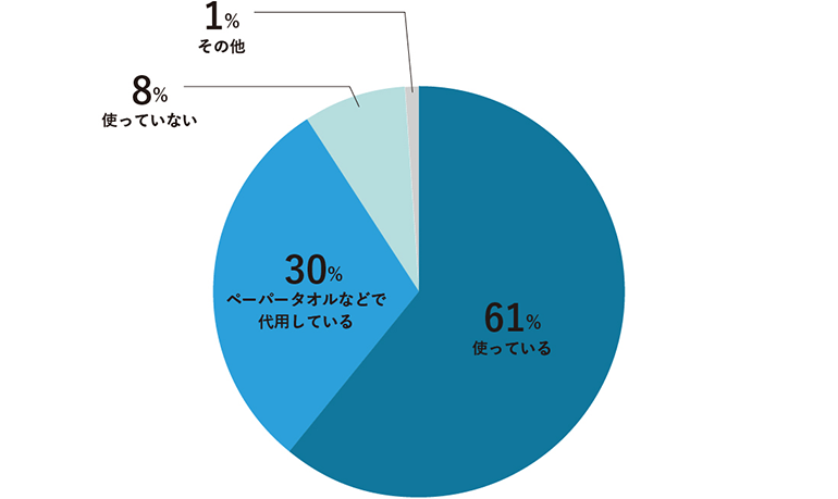 「使っている(61%)」「ペーパータオルなどで代用している(30%)」「使っていない(8%)」「その他(1%)」という結果に。多くのご家庭で使われているペーパータオルですが、臺ふきんの代わりに使っている方は、臺ふきん派の半分以下となりました。これには、近年の物価高などの影響もありそうです。「その他」としては、アルコール、重曹スプレー、ティッシュや古タオルを小さくカットしたもの、ウェットティッシュを使うといった意見が寄せられています。