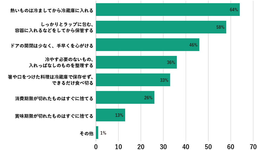 冷蔵庫の衛生対策は「熱いものは冷ましてから冷蔵庫に入れる(64%)」「しっかりとラップに包む、容器に入れるなどをしてから保管する(58%)」「ドアの開閉は少なく、手早くを心がける(46%)」の回答が上位に。庫內で雑菌を増やさない、付著させない、庫內溫度を一定にして食品の傷みを防ぐといった意識は多くの方が徹底しているようです。しかし、「消費期限が切れたものはすぐに捨てる(26%)」「賞味期限が切れたものはすぐに捨てる(13%)」といった、期限切れの食品に対する意識は、他の回答に比べると低いのが印象的です。