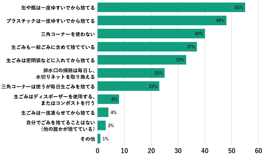 「缶や瓶は一度ゆすいでから捨てる(55%)」や「プラスチックは一度ゆすいでから捨てる(48%)」については、ごみのニオイ防止や害蟲対策の観點からも、気をつけている方が多いのは納得です。次に多かった「三角コーナーを使わない(40%)」は「見た目が良くないうえにヌメリが出る、コバエも寄ってくるので使わない」という意見が多く寄せられ、約4割の方が三角コーナーを導入していないことが明らかになりました。また最近では、三角コーナーに代わってポリ袋ホルダーや自立型の水切りごみ袋などが登場しています。