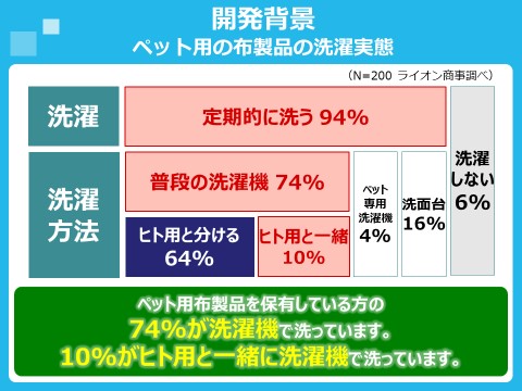 「當社の調査※によれば、ペット用の布製品を定期的に洗うと回答した方は女性オーナー様の94%」と教えてくれたのは、ライオン商事の森田さん。「そのうち、普段使う洗濯機でペット用品も洗う方は74%。うち、ヒト用の洗濯物と分けて洗う方は64%でした」。