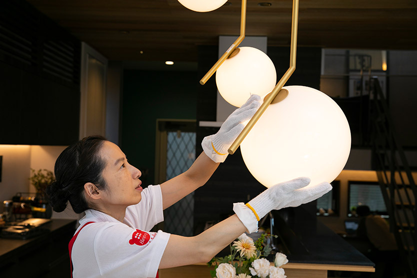 あと、見落としがちなのが照明器具。油汚れとほこりが混ざりあったものがつきやすいので、「軍手ぞうきん」で一緒に拭きましょう。