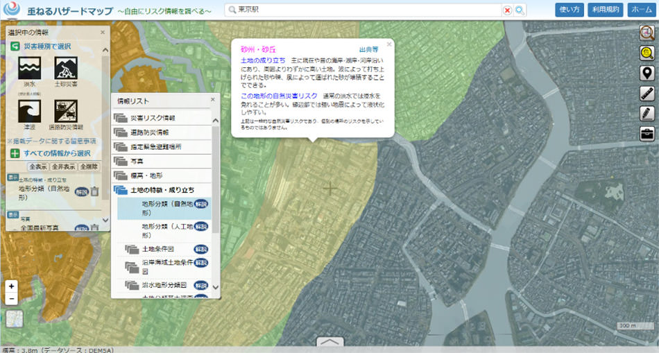 そもそも、家を建てるためには地盤の強い土地を見極めることが重要になってきます。そこで、活用してほしいのが、國土交通省の「重ねるハザードマップ」です。様々な土地の特徴の中で、その土地の成り立ちを確認することができます。例えば、一般的に宅地造成地で十分固まっていない盛土は地盤が弱く、不同沈下する恐れが。また、低地にあると周囲から水が集まりやすく、地盤が軟弱になりやすいともいわれます。このマップでは土地の成り立ちから、地盤の強さの目安がわかります。調べたい住所を入力すれば該當する場所を指してくれるし、白地図や衛星寫真とも組み合わせられるので、一般の方でも調べやすいですね。