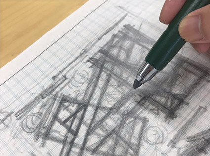 私が間取りを考えるときは、ドローイング用の芯が6mmくらいある太いペンを使っています。なぜ太いペンを使うかというと、細いペンを持つとどうしても細かく描き込みたくなるんですよね。太いペンを持って、ざっくり線を描いていく。そうすると何度も描き加えている間に、正しい線が濃くなって浮かび上がってくるのです。専門的な文具ではなく、鉛筆の先を尖らせずに描くというのでも大丈夫。