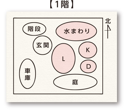 次に建物內部のゾーニングですが、ここで一番重要なのが階段の位置。階段は基本的には、できるだけ玄関から離れないように置くのが基本と言えます。次は、リビングやダイニング。暮らしの中心となるスペースを考えるのは難しいことですが、その答えは家族の生活の中にあります。一日を気持ちよくスタートするためにも、朝食は明るいところで食べたいですよね。それなら、ダイニングは朝陽を感じられる東側に設けるのが良いということになります。リビングは1階全體のつながりを考えると、ダイニングと玄関の間の南面に置くのが良いですね。キッチンは基本的に西側を避けて、ダイニングの近くにあるのがグッド。水周りの洗面室やトイレは、長時間過ごす場所ではないので、これらを西側や北側にゾーニングします。