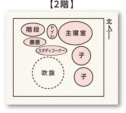 1階のゾーニングが決まったら、次は2階。階段の位置は決まっているので、まずはそこを書き込みましょう。要望にある吹き抜けは點線で記入しておきます。主寢室は西陽の熱を避け、さらに道路から離れた北東の角が良いですね。子ども部屋は朝陽で目覚めが良いように東側に設けることにします。トイレが必要なら、それも書き込んでおきましょう。2 階には各部屋が並ぶので、廊下が必要です。もし無駄に廊下が長くなるようなら、幅を少し広げて(30~50cm)通行以外の用途(子どもの共有スペースなど)も考えるようにしましょう。廊下の隅にカウンターをつくり付ければ、書斎コーナーのような空間もできます。このようにして、ざっくりとゾーニングしていくと、ほら目指す家の姿が見えてきましたね。