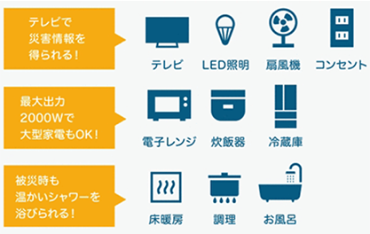 (電?レンジ、炊飯器はエネファーム稼働働時のみ利?として算出。[約10?間の內訳]エネファームの発電電?利?8?間+蓄電池のみ約2?間)?部対応できない地域?商品があります。