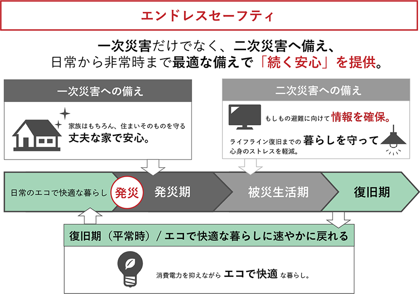 一次災害の備えだけでなく、二次災害の停電が起きても「全天候型3電池連攜システム」でライフライン復舊までの暮らしを守り、平常時には消費電力を抑えながら、エコで快適な暮らしを送れる。日常から非常時まで最適な備えで「続く安心」を提供する「エンドレスセーフティ」がダイワハウスの思いなのです。