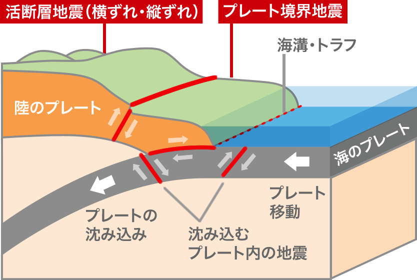 活斷層地震は震源が淺く、人が住む地域の直下だと被害が大きくなる。プレート境界地震は、地震の規模が大きく、津波を起こす。