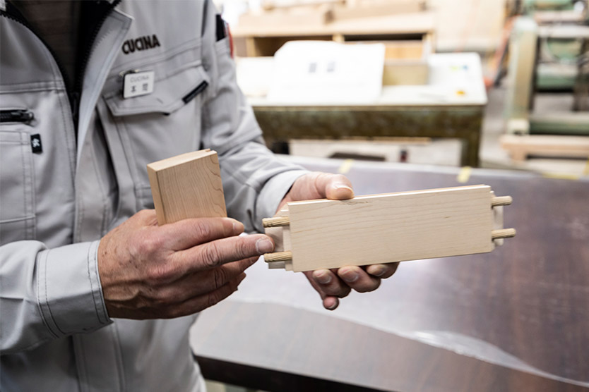 框組扉の組み立てには釘などの金物を使わず、「木ダボ」と接著剤で留めているそう。木ダボとは、木材同士を継ぎ合わせる際に使用する小さな木の棒のことです。この構(gòu)造を元にさまざまなデザインの扉の加工組立てを行います。