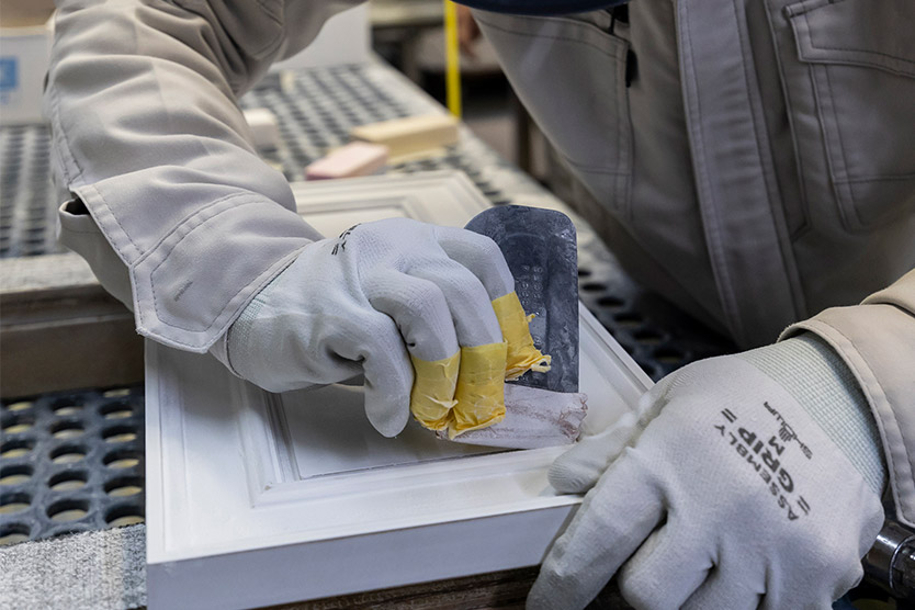組み立てた框組扉は、下塗りの後、表面をサンドペーパーで丁寧にならします。この後、カラー吹付けの工程に回されます。