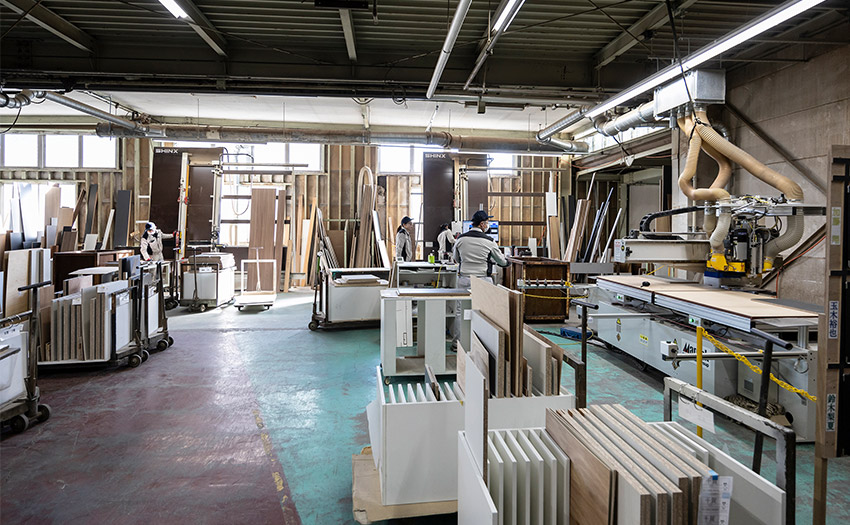 本間さん「框組(かまちぐみ)タイプの扉は、中央に薄い板を用い、四方に枠を組み合わせて構(gòu)成しています。四方の模様は回転刃を用いて削り出していくんですよ」
