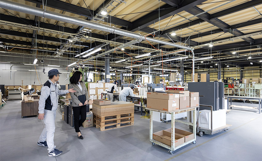 最後に、2024年5月から稼働している新棟を見學(xué)。ここではキャビネット全體の組み立てを行っています。カンカンカンとリズムのよいハンマーの音が聞こえてきます。