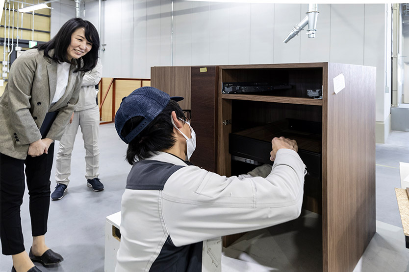 私はインテリアコーディネーターとして大和ハウスのお客さまにオーダーキッチンをご提案する機會が多いのですが、製造の現(xiàn)場を見るのは初めてでした。実は「工場」という言葉から、オートメーションで機械が作業(yè)する様子を想像していたのですが、予想以上に職人さんの姿が多く、機械と人が共同作業(yè)しているという印象でした。