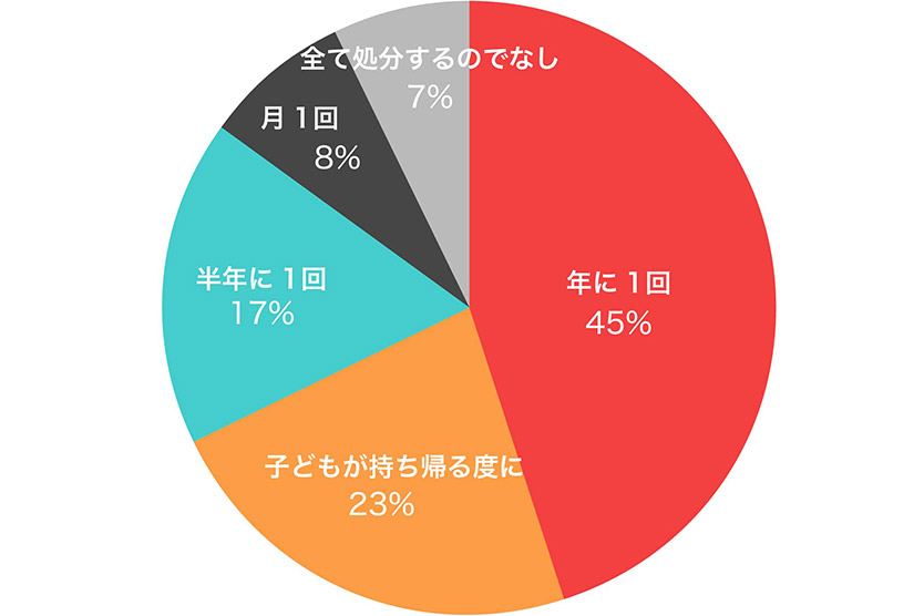 半數近くの45%の方が「年に一回程度の頻度で整理する」と回答。見直すとしたら、年末の大掃除?あるいは春休みや夏休みが始まる前、つくった作品をどっさり持ち帰ってくるときに整理するというご家庭もあるかもしれません。