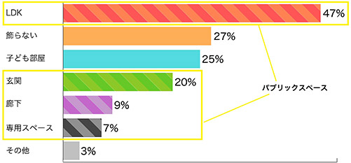 飾る場所については、LDKや子ども部屋、玄関、廊下などいろんなスペースが挙がりました。「子ども部屋はお子さん自身が見返したり遊んだりするため」と考えられますが、家族みんなが過ごすLDKや玄関?廊下などのパブリックスペースに展示しているご家庭も多くあることから、「みんなの目に觸れる場所に飾って作品を共有しようとする傾向も見てとれます。思い出あふれる家にしたいなら、家の中に家族の思い出を飾るギャラリーをつくるのもいいかもしれませんね。