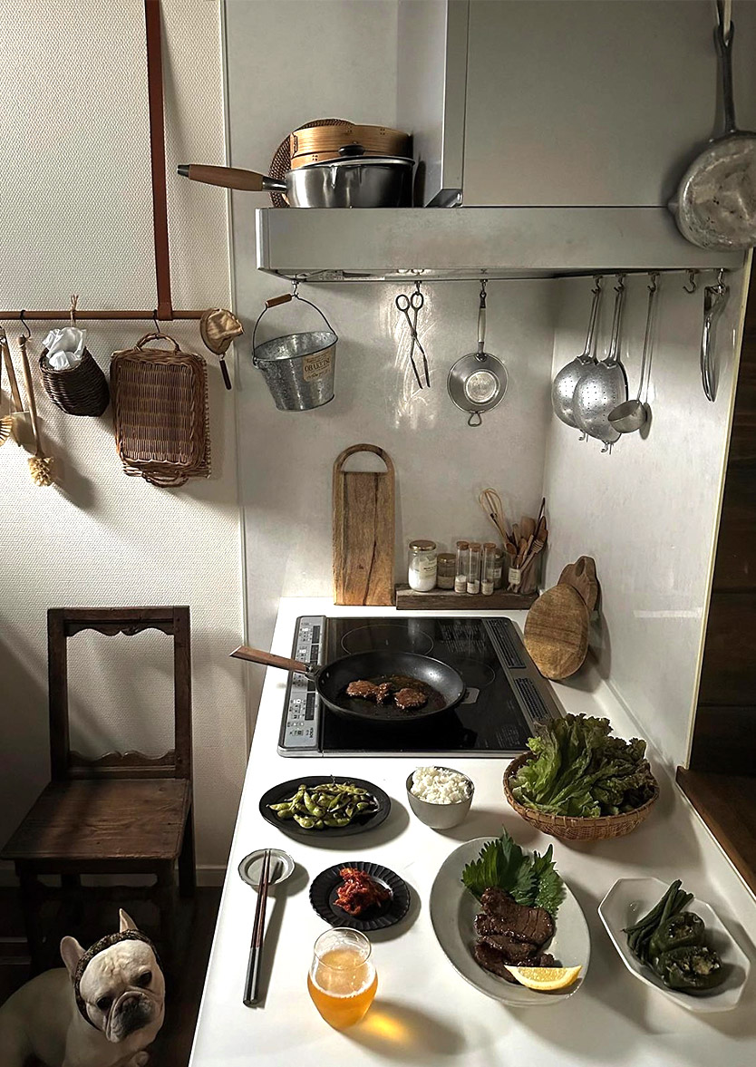 @su_a_sa_さん:「お酒を飲んでいると視界に入ってくる場所なので、気持ちよく飲めるように片付けて、キッチンからの眺めを考慮して家具を配置しています。キッチンから映畫やドラマを見ることも多いので、テレビが見える位置に置くのも大切なポイント。韓國ドラマを観ながらお酒を飲んでいると、〆がインスタントラーメンになることも(笑)。窓際でくつろぐクルン(愛犬)の様子もキッチンから見えて、癒やされています」