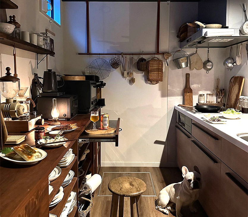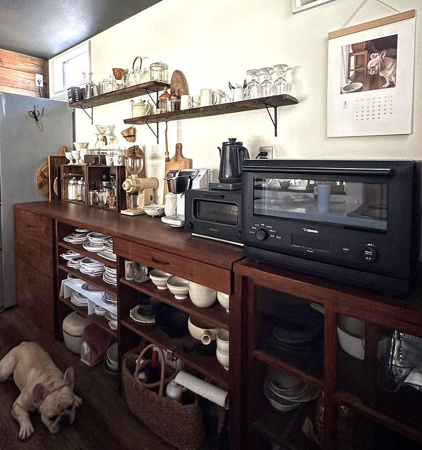 キッチンの主役は、ウォルナット調の壁や床に合わせてオーダーしたロータイプの食器棚。天板の高さを身長に合わせてセミオーダーされたもので、手前に引き出せるスライドトレーがキッチン飲みのテーブルとして活躍しています。