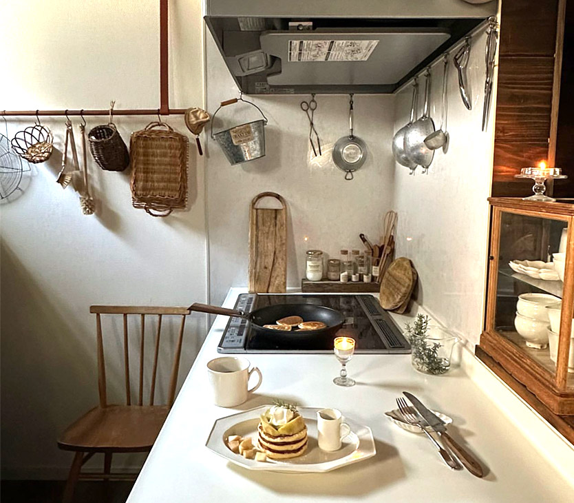 機能性の高い工業製品と趣のあるヴィンテージの調理器具をバランスよく織り交ぜて、見せる収納にしています。