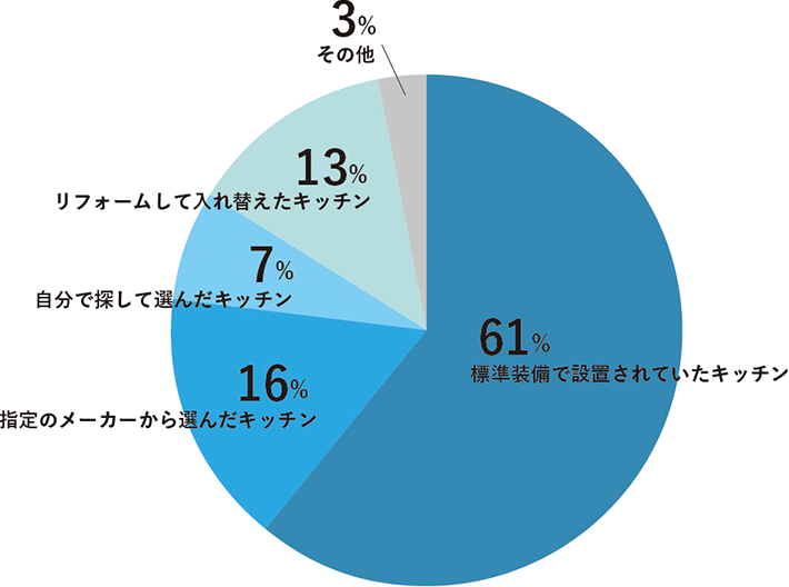 あらかじめ備え付けられたキッチンを使っている方が多いものの、「指定のメーカーから選んだキッチン」「自分で探して選んだキッチン」「リフォームして入れ替えたキッチン」を足し合わせると、3.5割の方がご自身や家族の好みをキッチンに反映させているという結果になりました。
