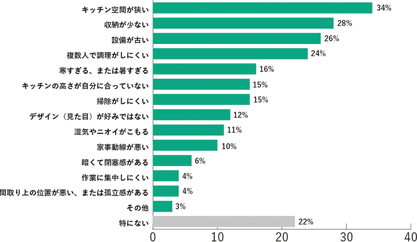 不満の上位に上がったのは「キッチン空間が狹い」(34%)、「収納が少ない」(28%)、「設備が古い」(26%)、「複數人で調理がしにくい」(24%)でした。不満の詳細を見てみましょう。