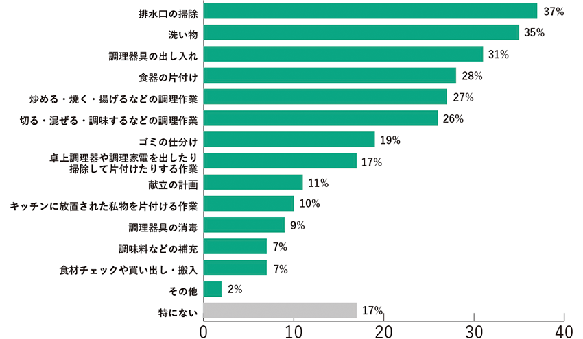 理想とするキッチンの條件については、「不満に感じているところ」に対応するように「十分な広さがある」(53%)、「作業動線が良く、調理がしやすい」「掃除がしやすい」(同43%)、「収納が充実している」(35%)が票を多く集めました。手間やストレスがかかるキッチンでの作業を、少しでも効率的に済ませたいという願望が表れた納得の結果です。