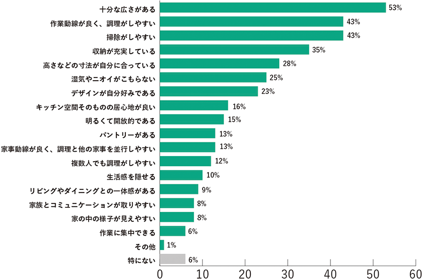 また、優先度として高くはないものの、「デザインが自分好みである」「キッチン空間そのものの居心地が良い」「明るくて開放的である」「家族とコミュニケーションが取りやすい」を重視する意見も一定數ありました。キッチンの居心地の良さは作業のモチベーションアップにつながりますし、家族が集まれる十分な広さと快適性を備えたキッチンは家族団らんの場や食育の場になるでしょう。