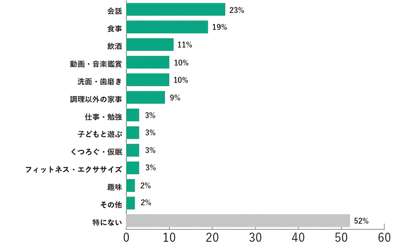 家族でキッチンに立ってコミュニケーションを楽しむほか、動畫視聴や音楽鑑賞、晩酌、エクササイズなど、調理中や待ち時間の「ながら」活動に関するコメントが多く寄せられました。また、ご自身がリラックスできたりする場としてキッチンを活用している聲も見受けられました。