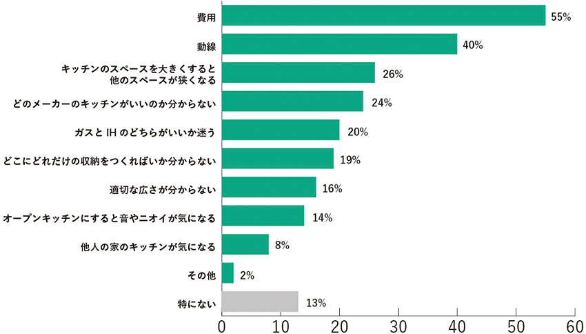 最多は「費用」(55%)でした。「理想のキッチンをかなえるにはいくらかかるのか。どこまでお金をかけるべきなのか」「物価高で設備費用などの高騰が懸念される」という意見がありました。