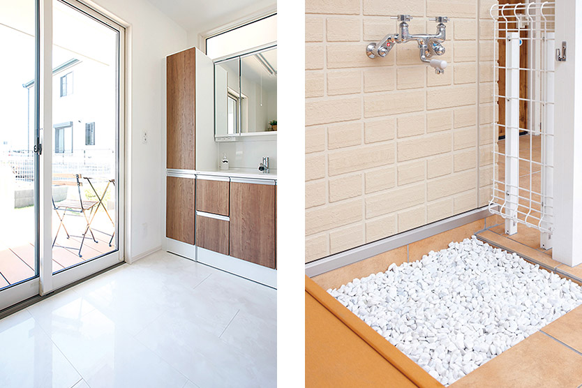 さらに、さまざまな暮らしのアイデアにも注目です。例えば、散歩から帰って汚れた足を洗ったり、手入れをしたりできる玄関や、出入り口近くに設けるシャワールーム。シニア犬でもラクに動けて、飼い主も手助けしやすくなるのもうれしいですね。また、リビング內に設置できるインナーテラスは、人間の生活動線と分けられる位置にあり、同時にリビングにいる飼い主を目で追うことができるので、犬にとってとてもリラックスできる場所になります。また、キッチンや階段、屋外への飛び出しなど、危険な場所への出入りをコントロールできるのもポイントです。