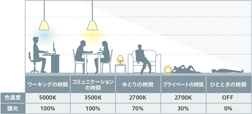 照明を人間の心や體に寄り添う形で使用すれば、さまざまなプラスの効果が得られることが近年わかってきました。照明の色や明るさを調(diào)整することで、日々を快適に過ごせるだけでなく、仕事や學(xué)習(xí)時(shí)の集中力が高まったり、安全性や効率性のアップにつながったりします。