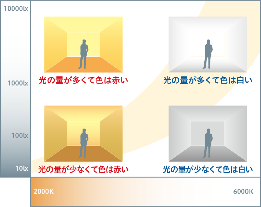 「色」と密接にかかわっているのが「明るさ」です。光の色に合わせて照度(明るさの程度)を調(diào)整するのが良いでしょう。高い照度の場(chǎng)合、白い晝白色の光は爽やかな空間を演出しますが、照度を抑えすぎると陰気で寒々しい印象を與えます。一方、電球色は、照度を抑えるとおだやかな雰囲気になり、照度が高すぎると暑苦しさを感じさせます。このような光の色と明るさ、心理の関係を「クルーゾフ効果」と言います。色と明るさの関係に気を配りながら照明計(jì)畫を考えましょう。また、光をより効果的に空間に取り込むため、光の色と明るさを1日の中で時(shí)間帯に合わせて変更することも有効な手段です。