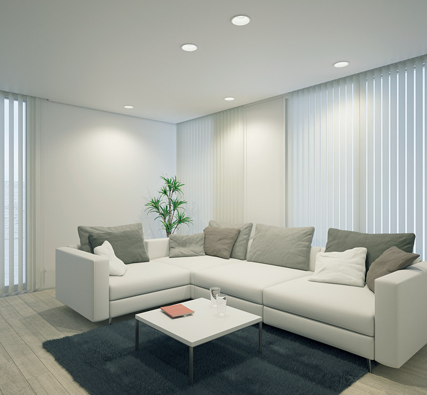 環境光の主流になりつつあるのがダウンライト。天井に光源を埋めこむタイプの照明なので、シーリングライトなどと違い天井がフラットになり、スッキリとした空間に見せてくれるのが特徴です。注意點として、くつろぎたい場所の真上に光源があってまぶしい、テーブル面が暗がりになって作業しづらいといった失敗をしないために、事前にしっかり設置場所を考える必要があります。
