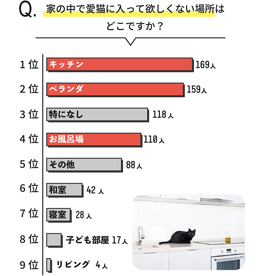 貓の飼い主さん498人に実施したアンケート調(diào)査によると、愛貓に入ってきてほしくない場所の1位は「キッチン」。続いて、ベランダやお風呂場などが挙げられました。共感する方も多いのではないでしょうか?