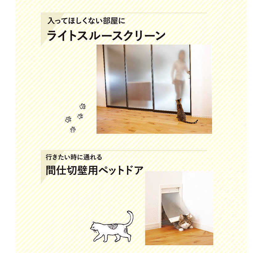 「ライトスルースクリーン」は、貓に入ってきてほしくないキッチンなどに設置することで侵入を防ぎます。半透明なので、お互いの気配を感じることができ、貓を不安にさせない配慮も。また、間仕切壁用ペットドアを取り付ければ、貓が自由に行き來できる貓専用のドアを作ることも可能です。必要な時だけロックできるので、フレキシブルに活用できます。