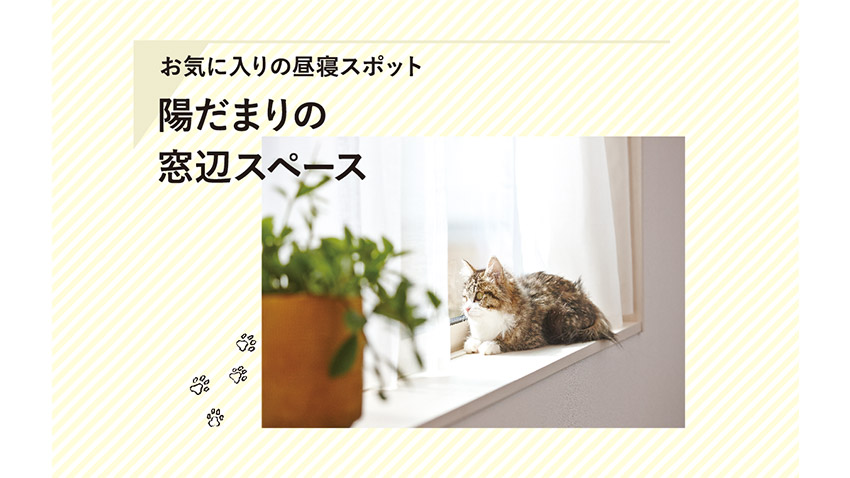 貓が室內(nèi)でも日光浴を楽しめるよう、窓前の臺座の幅を広げて外の観察も晝寢もできる空間に。貓が誰にも邪魔されないリラックススペースとして重寶します。