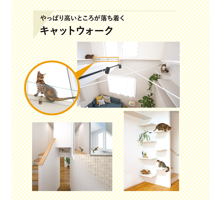 高いところから眺めるのが好きな貓のために専用通路を設けることで、自由に動き回れる動線を確保。行き止まりを減らすことで、退屈させません。