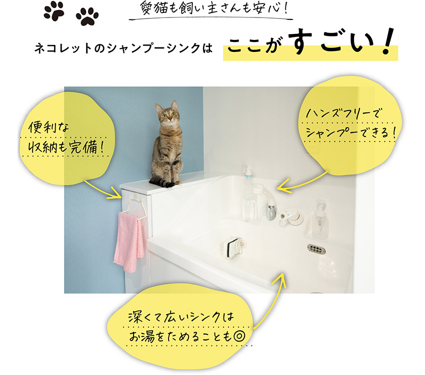 自宅シャンプーが手軽にできる幅広深型シンクと自動で流水洗浄してくれるトイレパンを備えた貓用水洗設備です。ハンズフリーでシャワーができたり、お湯をためて全身浴が可能だったり、愛貓と飼い主さん両方のストレスを軽減してくれる機能が充実。自宅シャンプーに挑戦したい方にこそ、おすすめです。