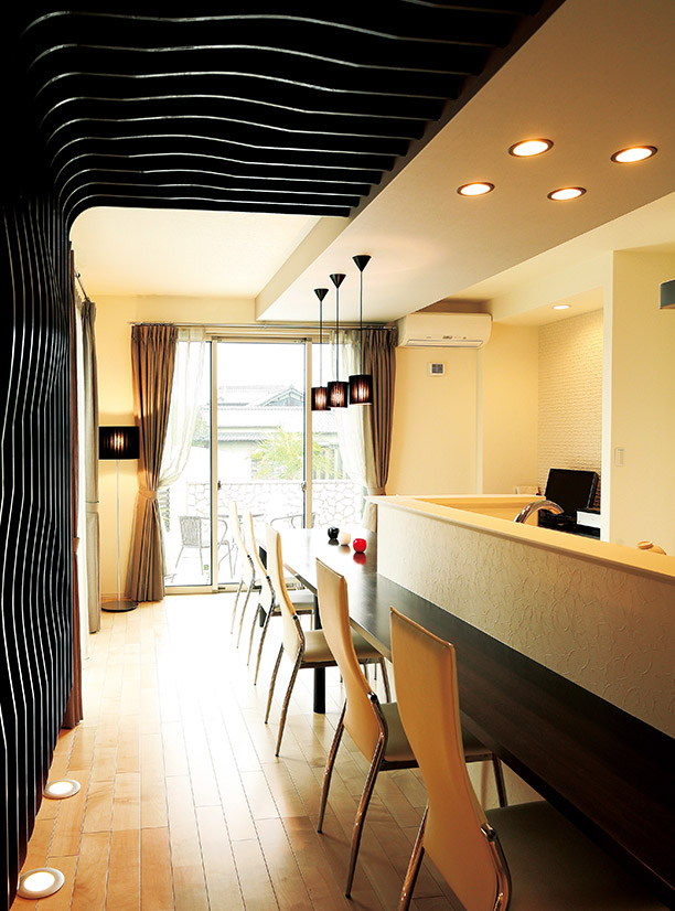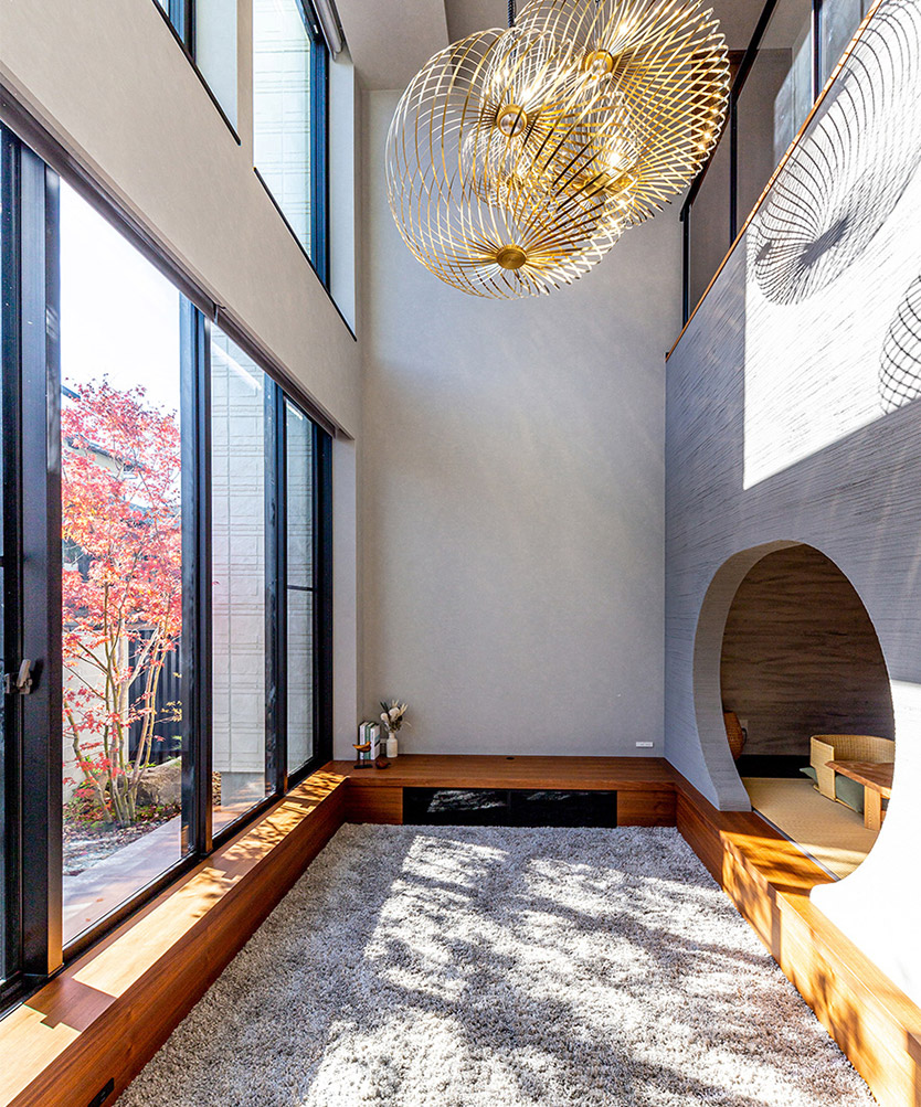 床面を深く下げ「縁側(cè)」に見立てたロースタイルリビングから、右手の和室へ。ゴールドの照明が和と洋をやさしくつなぎ、優(yōu)雅な曲線とシャープな直線が、空間をやわらかく融合します。