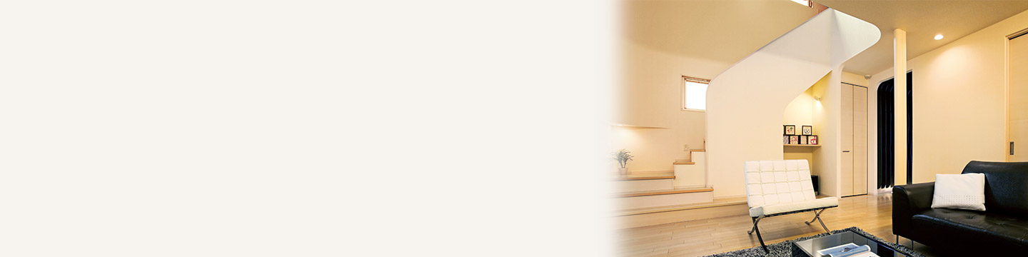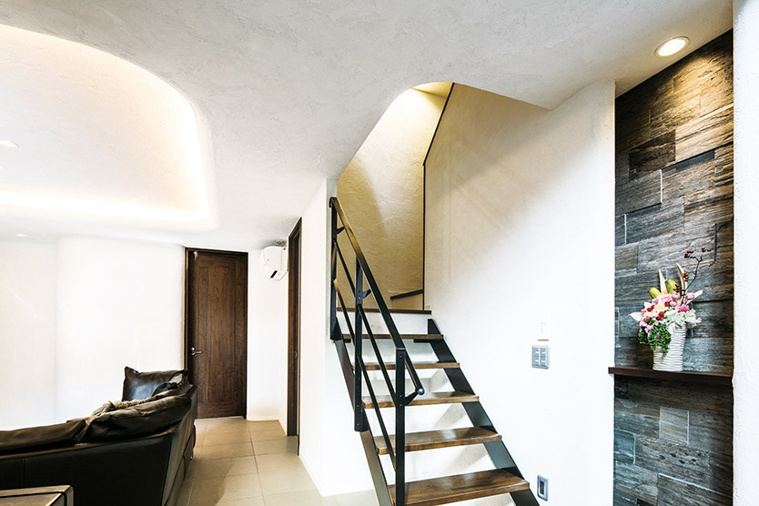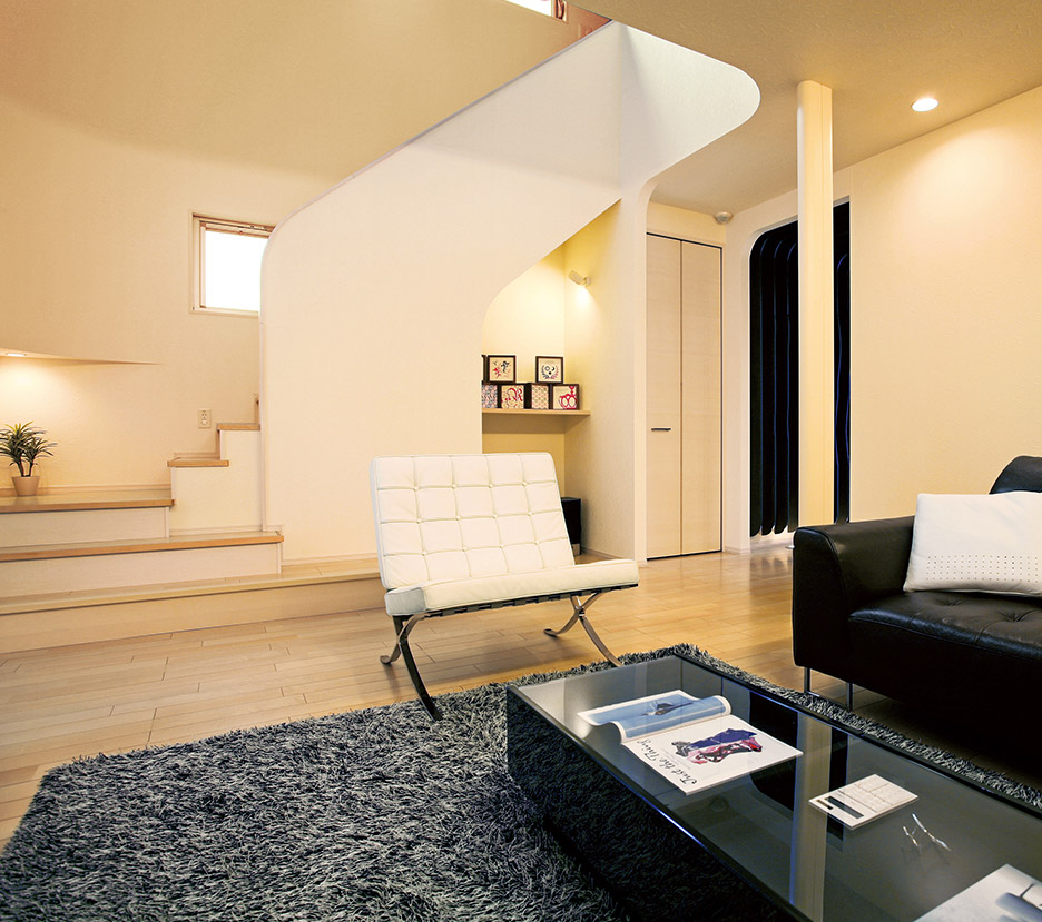 直線的な建物を丸くくりぬいたようなリビング階段の事例。空間的なねじれが、動きをつくり出しています。また、階段の踴り場は、逆Rニッチ(飾り棚)が印象的です。
